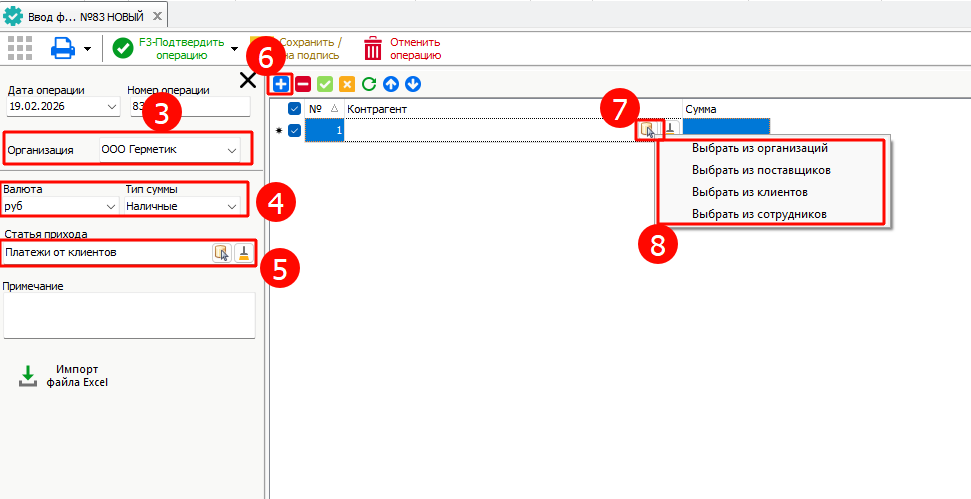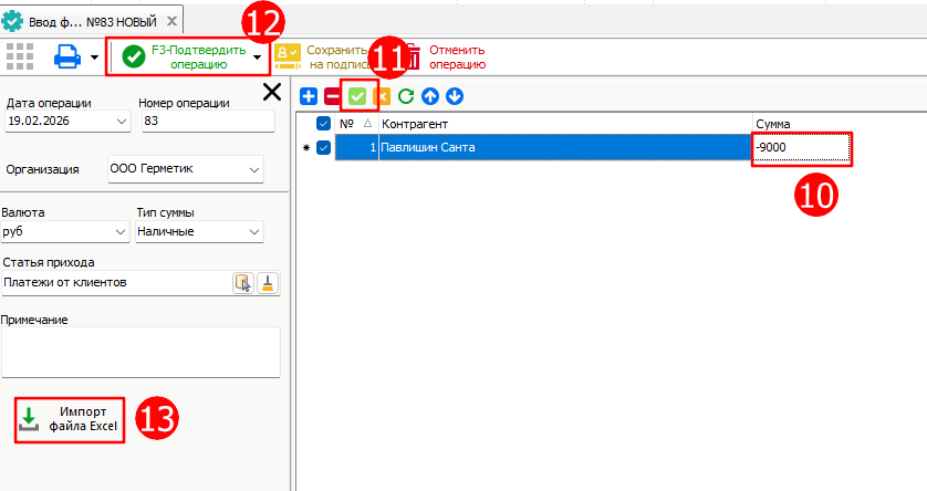 13 - Если у вас большое количество контрагентов для переноса, то вы можете импортировать Excel файл с суммами.