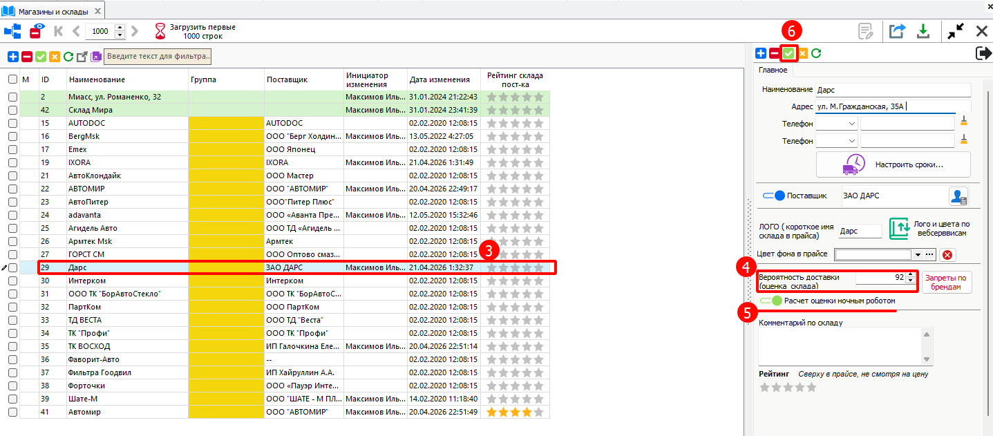 4 - В поле «Вероятность доставки (оценка склада)» можно указать значение вручную. Это значение будет использоваться при работе с данным складом.