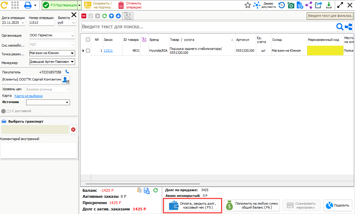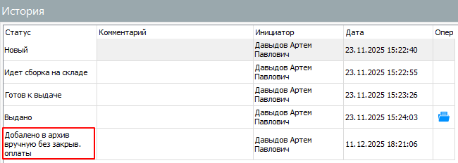 Информация! В истории позиции, которая была переведена в оплачено в ручном режиме, будет зафиксирована информация, что было переведено в архив без оплаты!