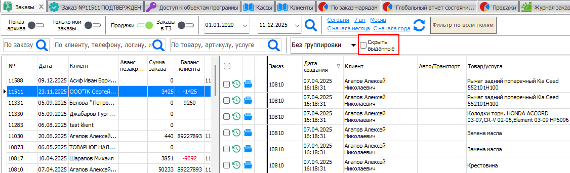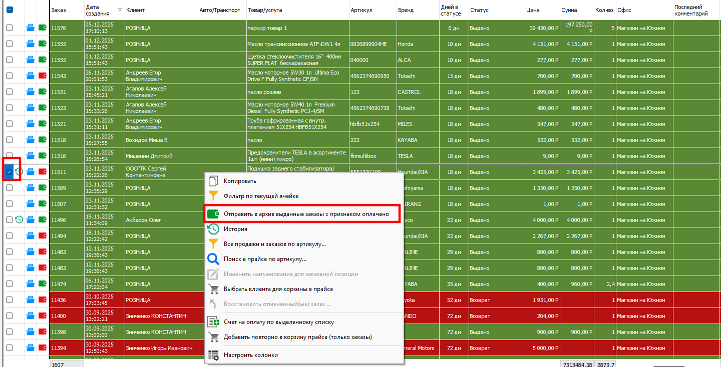 2 - Затем правой кнопкой мыши - Отправить в архив выданные заказы с признаком оплачено
