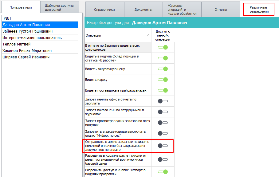 Важно! Перевод в оплачено разрешено только для тех пользователей, у которых открыт доступ в админке - доступы к объектам программы - различные разрешения - Отправлять в архив заказные позиции с пометкой оплачено без закрывающих документов по оплате.